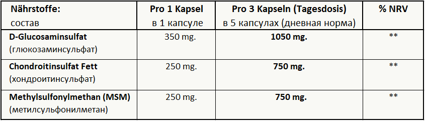 D- глюкозаминсульфат (из ракообразных), хондроитинсульфат, метилсульфонилметан (МСМ), желатин (оболочка капсул), разделительный агент- магниевые соли жирных кислот.