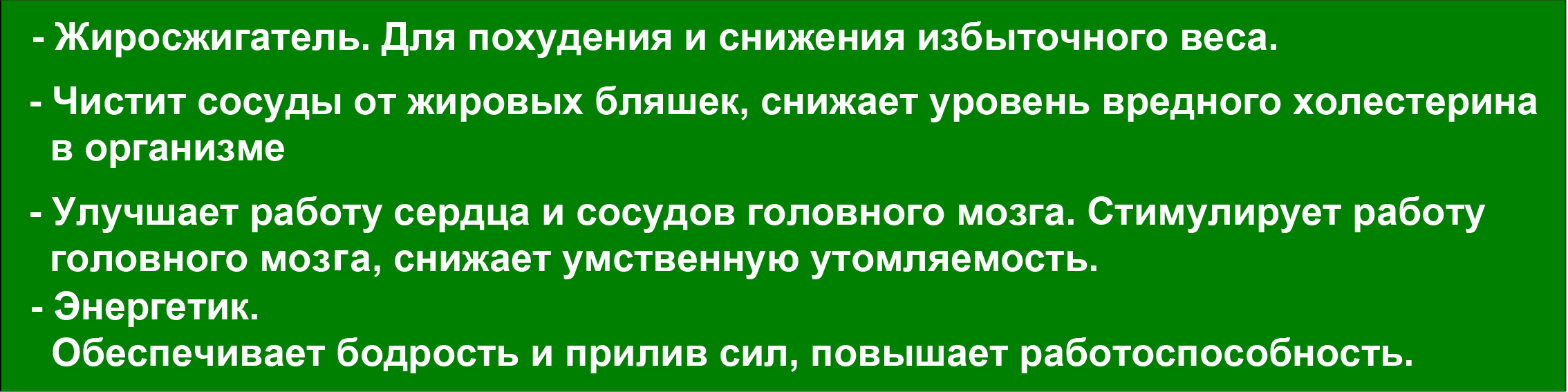 Жиросжигатель. Для похудения и снижения веса. Энергетик. Повышение работоспособности, снижение утомляемости. Улучшение работы сердечно-сосудистой системы.