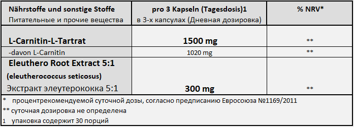 Включает в свой состав Л-карнитин тартрат и экстракт элеутерококка 5:1