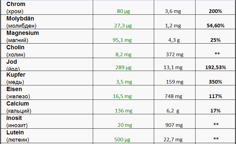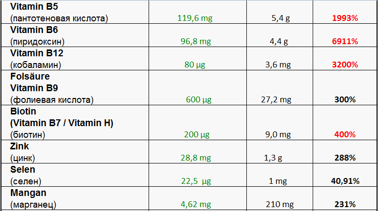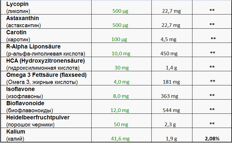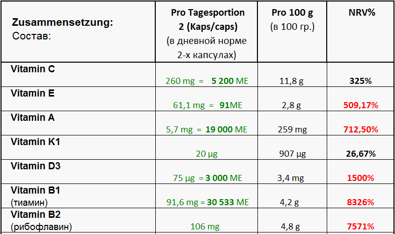Максимальные дозировки и сбалансированность продукта в соответствие с требованиями норм Германии к пищевым продуктам.